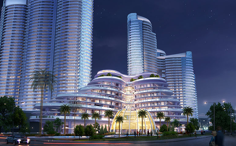 【天誉半岛】主要由住宅、办公及其配套设施等组成。其中A1栋为16层55米高公寓;A2、A3栋为两座38层123.55米超高层住宅楼;A4栋为30层高113.4米高办公楼;A5~A7栋为38层~52层超高层住宅楼,地下设置3层,总建筑面积约425524平方米。